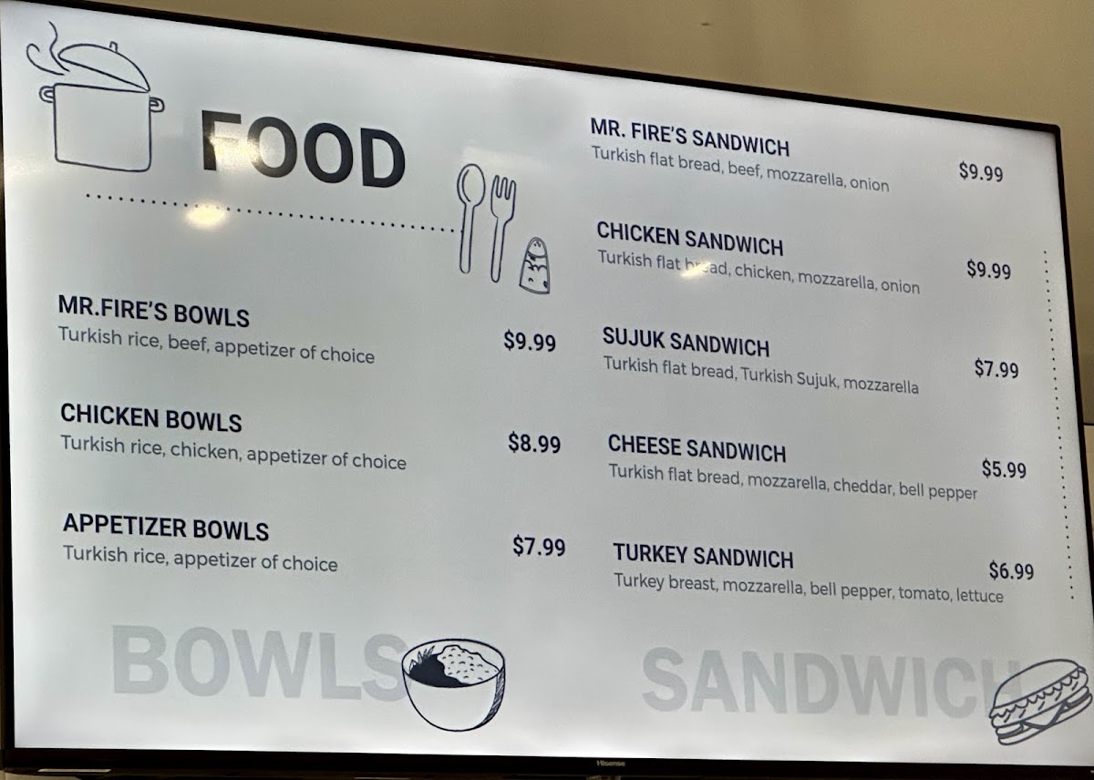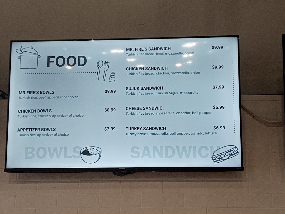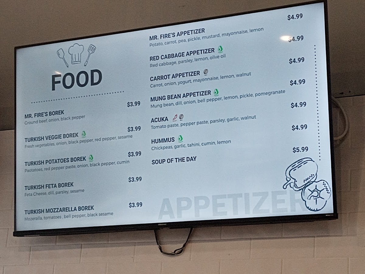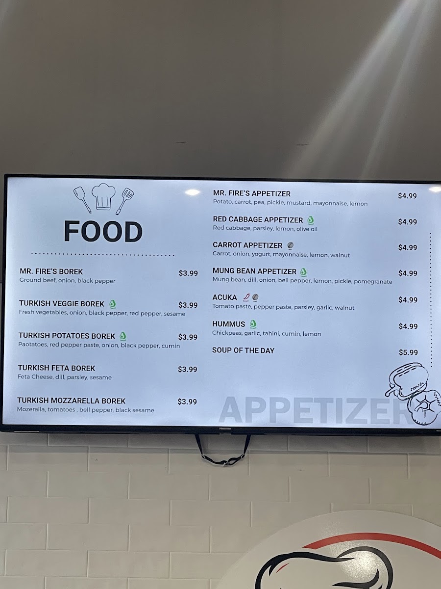 Cuisine Type: At Mr Fire's Kitchen, the menu is a delightful homage to Turkish comfort food. From savory bowls to delectable pastries, you'll find a variety of options that cater to every palate. Indulge in the Chickeen Bowl, a savory concoction of tender chicken, refreshing salad, and delightful chickpeas, all for just CA$8.99. If beef is more to your liking, the Beef Bowl offers a similar satisfying experience for CA$9.99. For those looking for lighter fare, the Appetizer Bowl, priced at CA$7.99, provides a refreshing mix of flavors and textures.